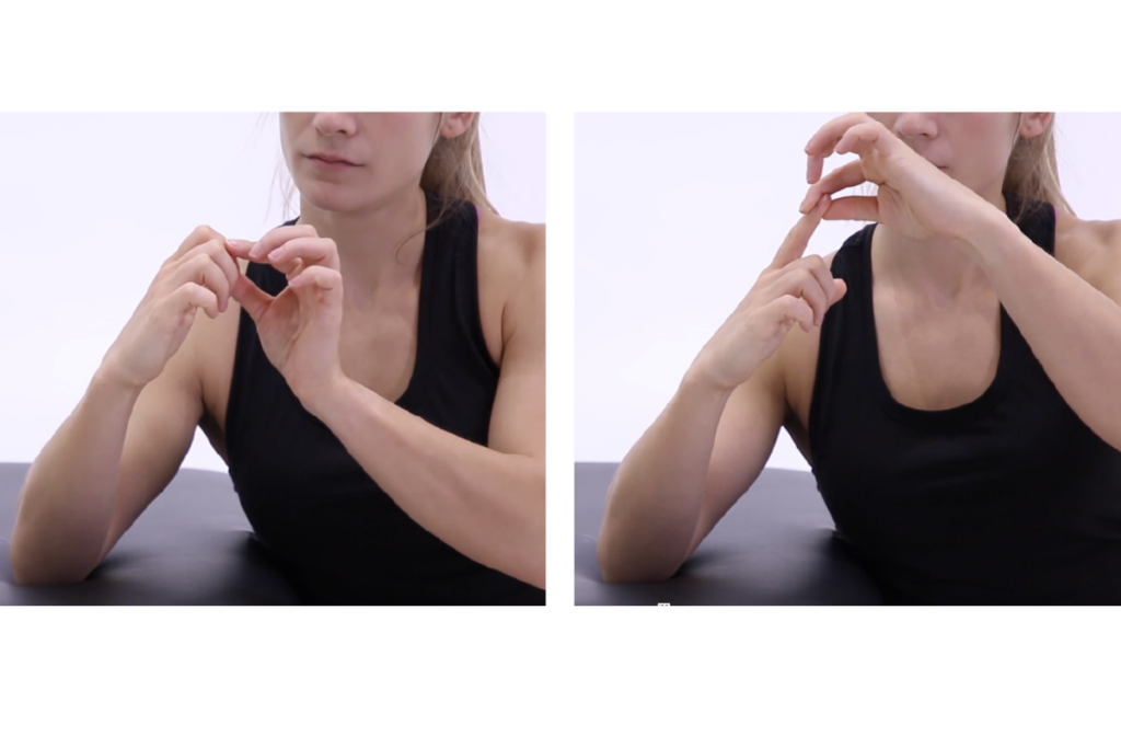 Start by sitting in a chair with your arm resting on a table. Grab your index finger with your free hand’s thumb and index finger and extend it at your middle knuckle. 1 rep, 2 sets, 30 seconds hold.